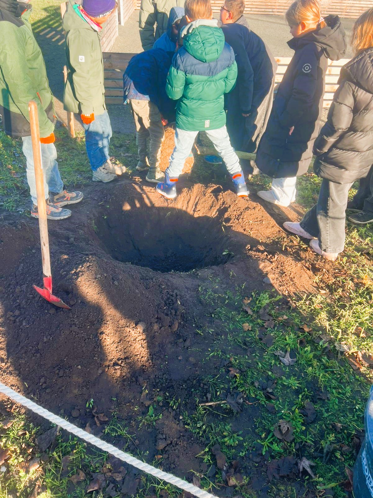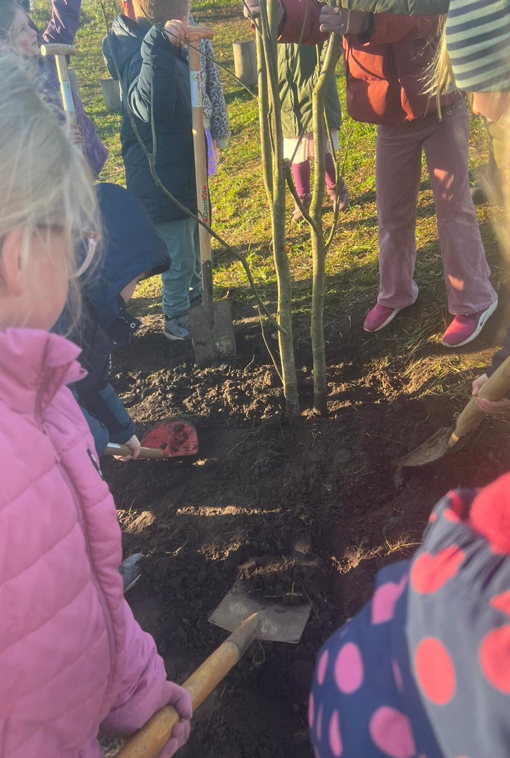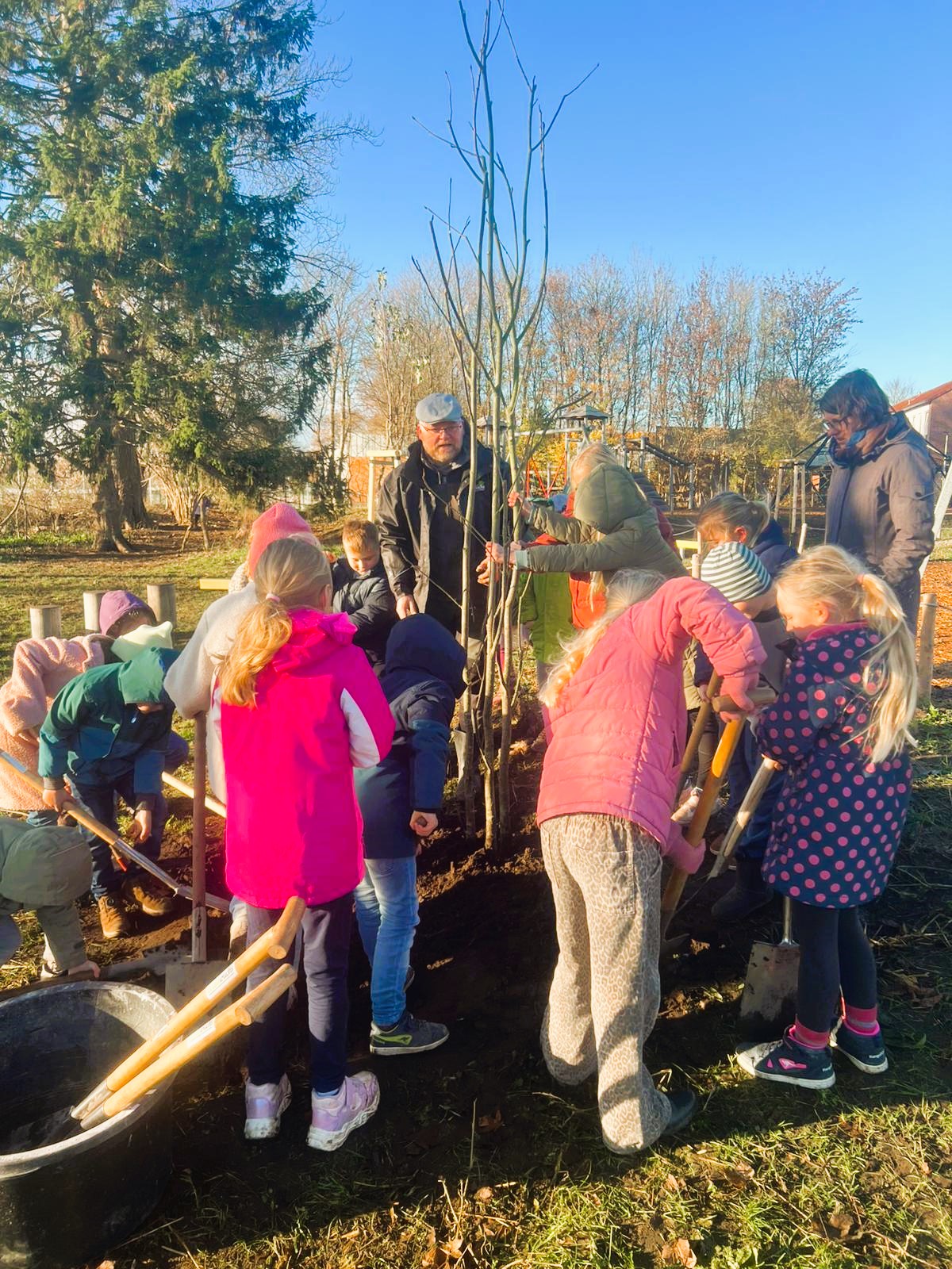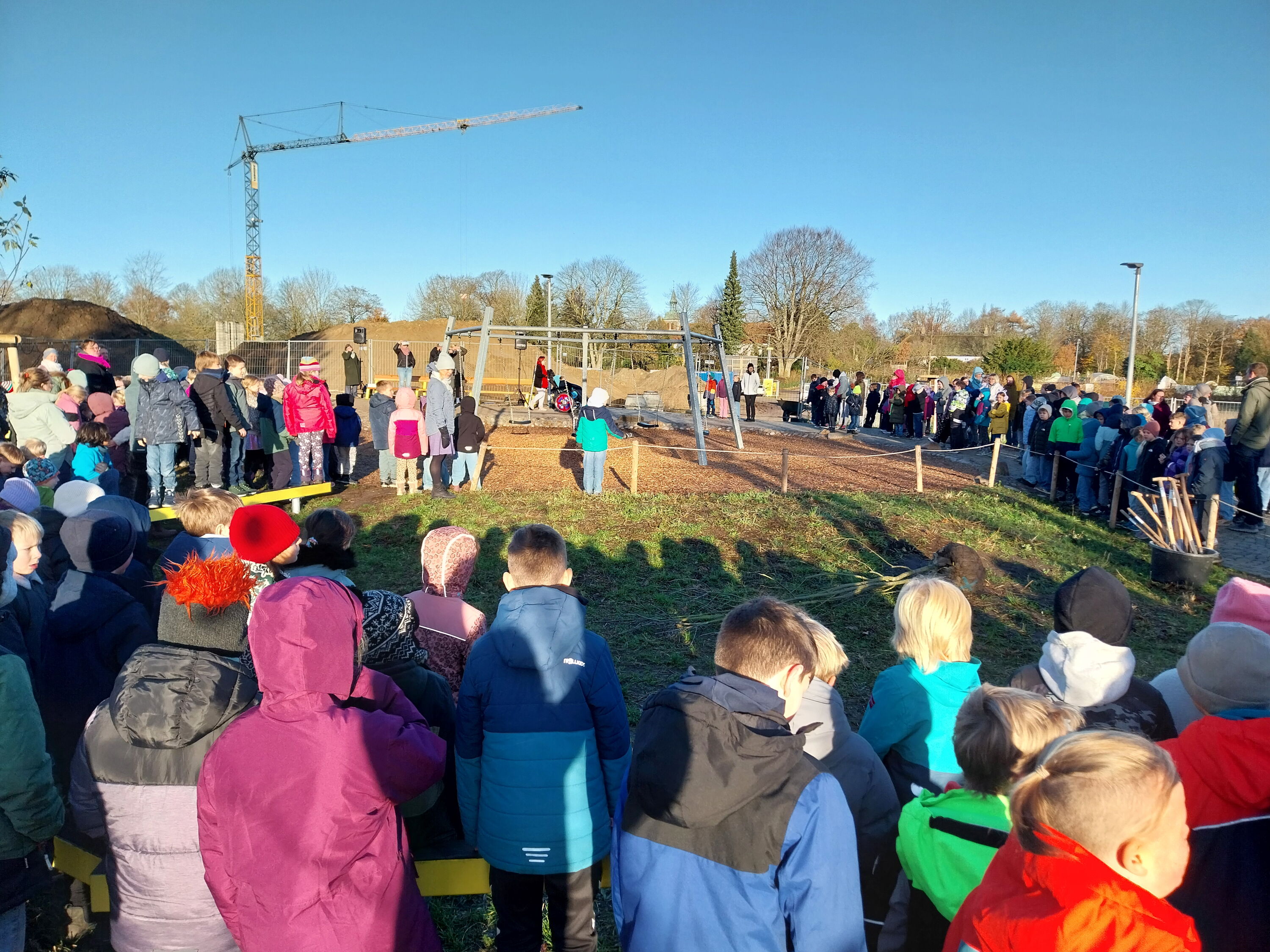 Aufgrund der großen Baustelle für unseren Erweiterungsbau musste der alte Spielplatz schon vor einiger Zeit weichen. An neuer Stelle entstand in den letzten Monaten ein neues Spielgelände. Auch Fußball kann nun endlich wieder gespielt werden. Den neuen Spielbereich haben wir heute feierlich eingeweiht. Neben allen Kindern waren auch Nachbarn der Schule sowie Vertreter*innen der Stadt, die das Projekt begleiten und ermöglichen, zu Gast. Nach einem kleinen Rahmenprogramm durften alle Klassensprecher*innen gemeinsam zwei Bäume pflanzen. Wir bedanken uns bei allen, die das neue Spielgelände ermöglicht haben und die Kinder heute beim Bäumepflanzen unterstützt haben!